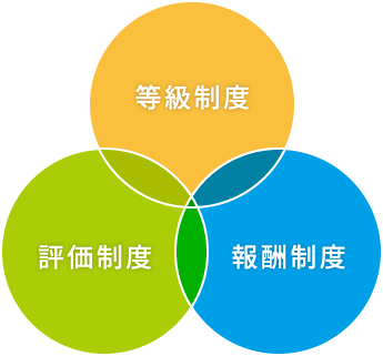 「評価制度」「報酬制度」の3つを連動させて構築しています。各等級に求められる要素を細かく設定し、社員一人ひとりのスキルや成果を的確に評価できる仕組みです。